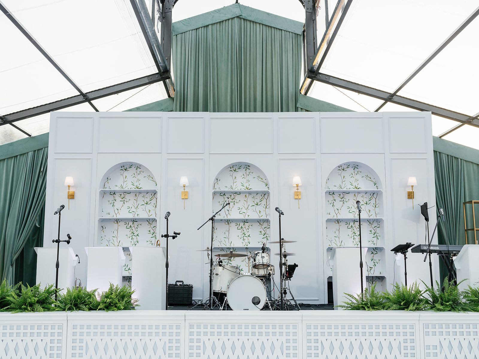Mood Board: Lane Banquette, White Gracie Dining Chair with Linen Cushion, Natural Wood Arthur Dining Chair with Natural Linen Cushion, Gold Shelf, Blue Gourd Lamp, Macy Sofa, Tuscany Console Table, Napa Dining Table, Kelsey Coffee Table, White Lattice Bar, Lattice Cake Table, Beige Sisal Rug, Phillip Arm Chair, Marble Accent Table, Octagon Display Table, Arched Backline, White Lattice Stage Facade with Columns, Round Hampton Bar with custom vinyls, and Pedestal for Round Hampton Bar.