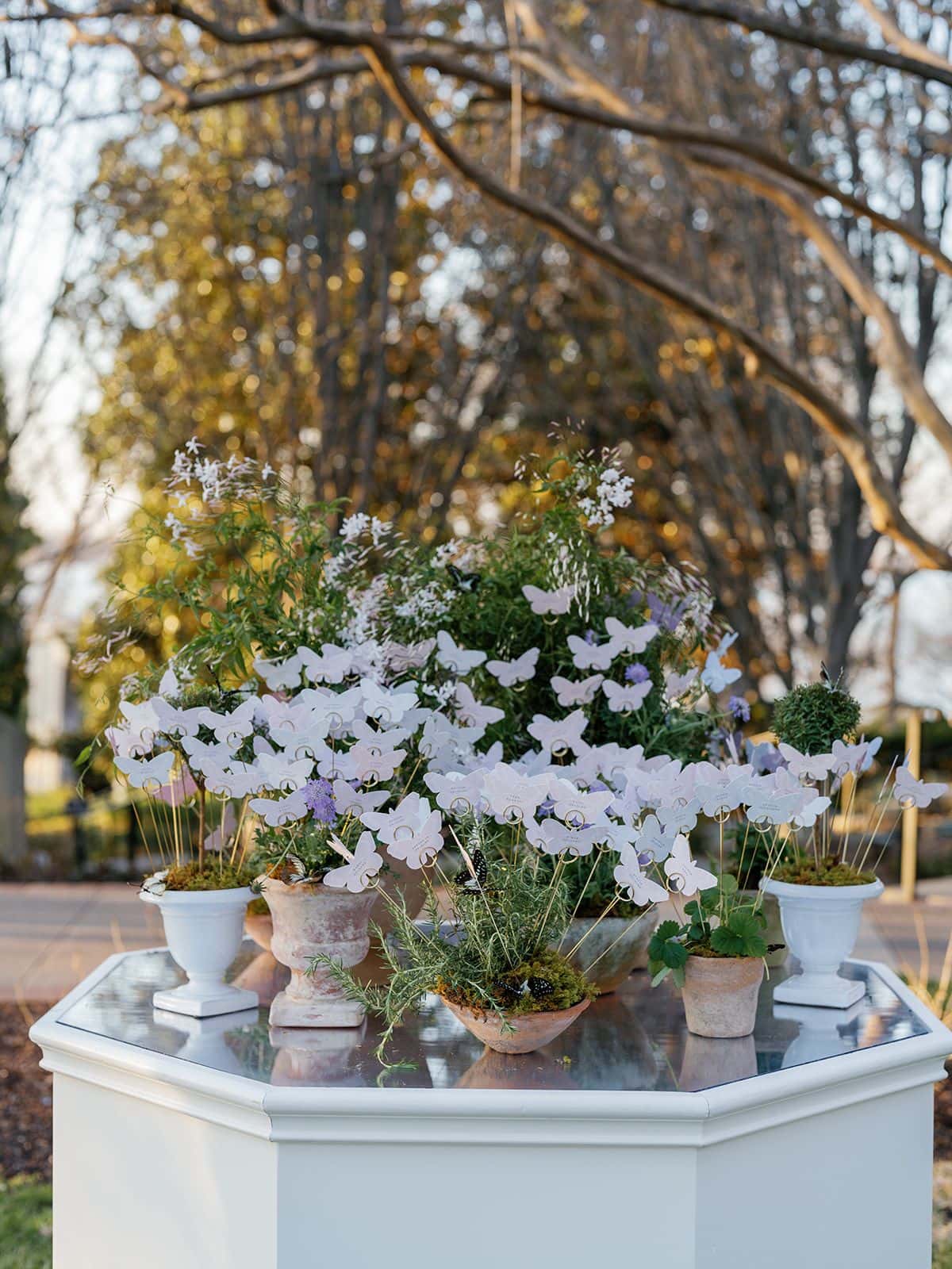 A memorable event design is all about the details—every element should feel intentional and contribute to the overall aesthetic. Instead of leaving spaces bare, a well-placed accent table can serve as a stylish platform for personal touches like framed photos, floral arrangements, or thoughtfully displayed seating charts. For Tess and Dalton’s wedding, our Lattice Cake Table provided the perfect display for their breathtaking cake by Sugar Bee Sweets. Outside, our Octagon Display Table showcased a romantic arrangement of florals and butterfly-adorned seating cards, adding an extra layer of charm and artistry to the celebration.